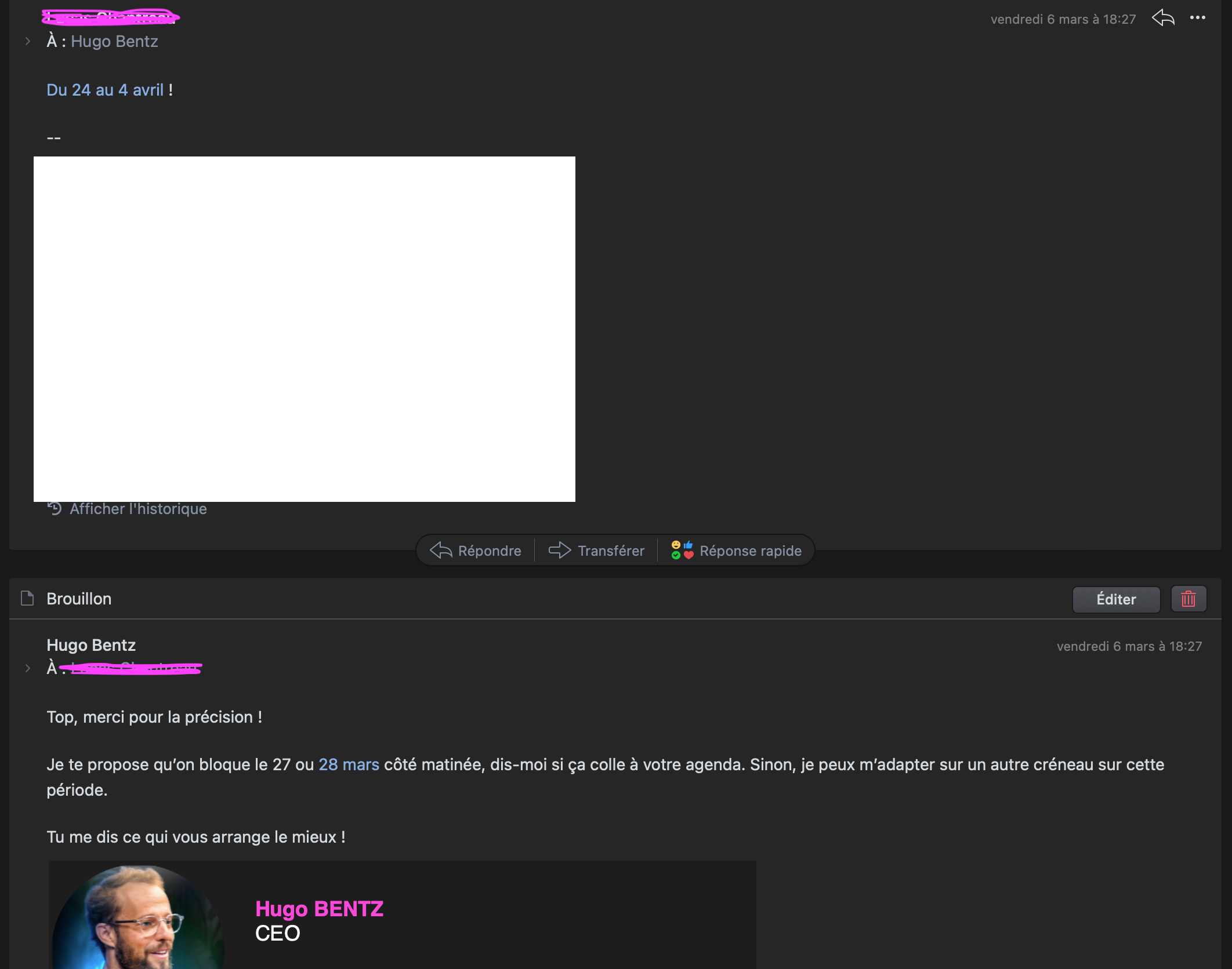 â Spark me propose 3 crĂ©neaux directement en fonction de mon agenda, rĂ©dige le mail, et me le fait valider.